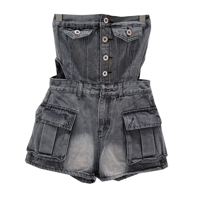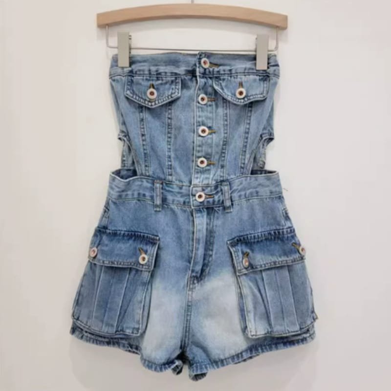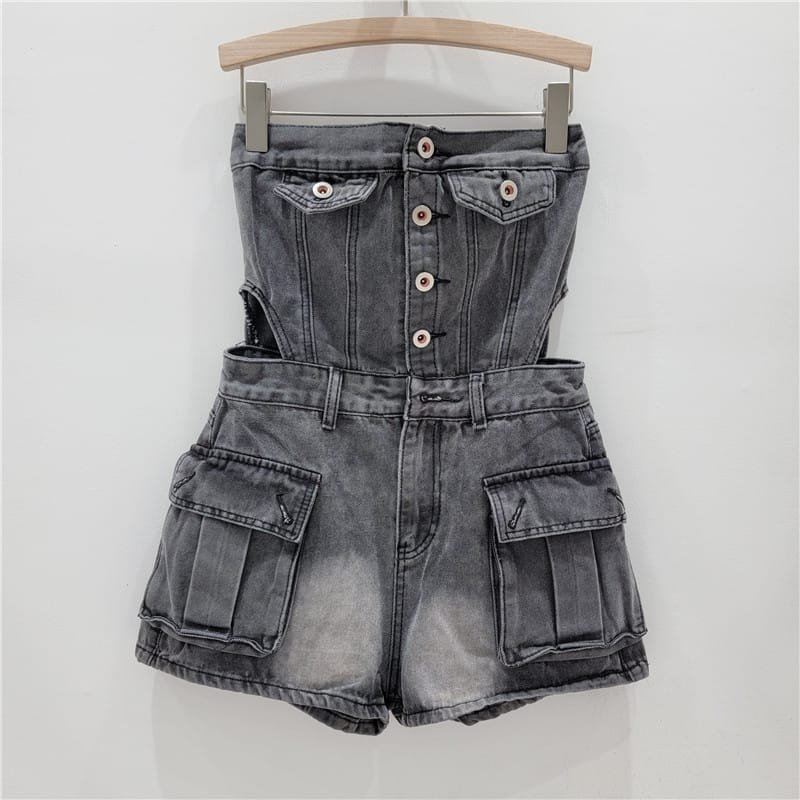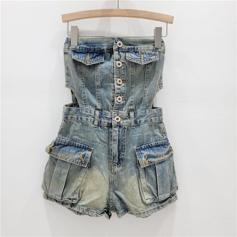 Hot Girl Breasted Hollow-out Midriff Tube Top Cowboy Siamese Shorts For WomenHot Girl Breasted Hollow-out Midriff Tube Top Cowboy Siamese Shorts For Women