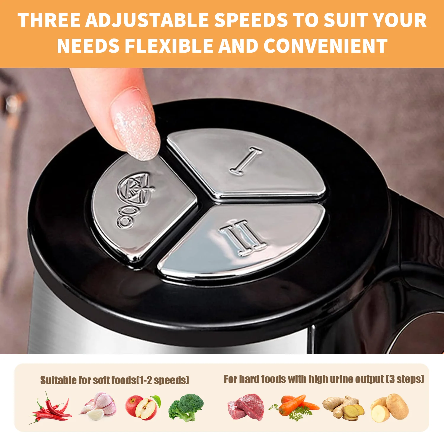Dual Speed Control: High and low speed options for soft and hard foods to meet different cooking needs.
