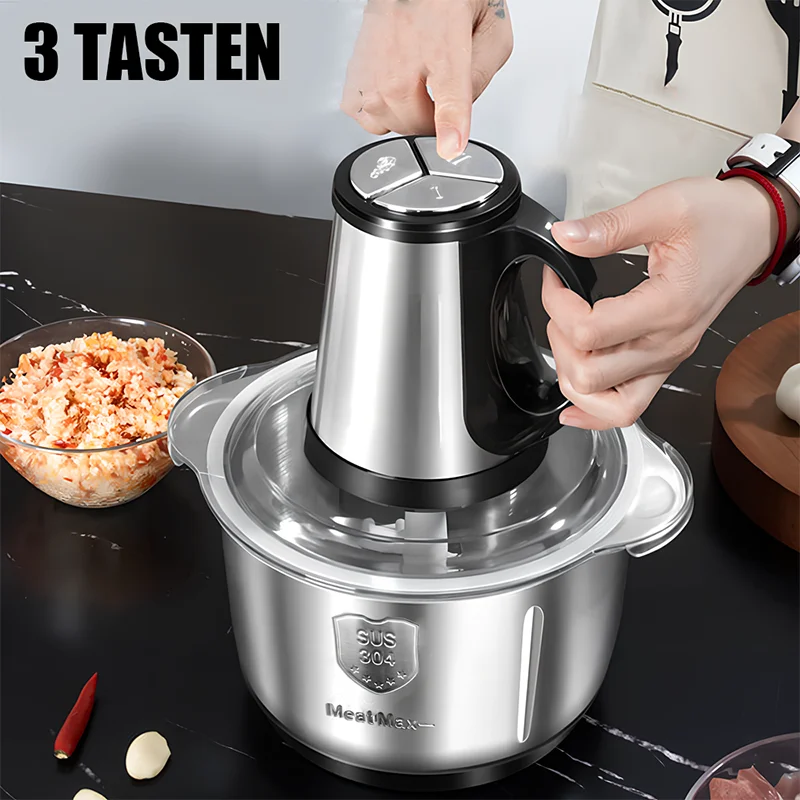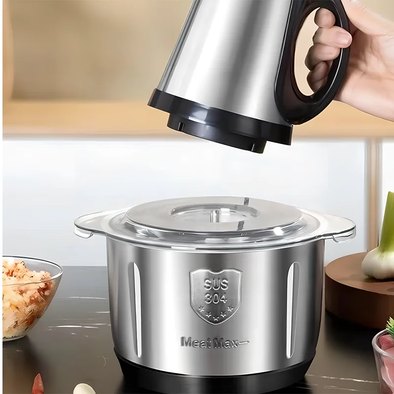Electric meat grinder made of stainless steel and PP, designed for efficient food processing.